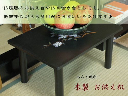 【セール40%off】【送料無料】これは重宝します♪上品な花柄で法事やお盆など経机の脇机としても【お彼岸用にも】お供え机幅45cm 花水木 黒塗 価格: 9,135円 レビュー評価:0.0 レビュー数:0 サイズ幅45cm×奥行30cm×高さ22.5cm 材質MDF木製/黒ウレタン塗送料無料(一部地域・離島を除く)納期入金確認後、午前中までのご注文で即日出荷いたします。(土日祝日を除く)ただし在庫状況によっては、日数がかかる場合がございますので、お急ぎの場合はメール又はお電話にてご確認ください。備考使わないときなどは脚は簡単に取り外しができるので、無駄なスペースがいりません。道具不要のネジ式なので脚が簡単に取り付けできます。可愛くて上品な花柄はお供えとして頂いた果物やお線香を置く台として最適です。 Supported by 楽天ウェブサービス |